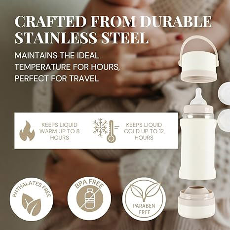 The insulated stainless steel baby bottle is a travel-friendly feeding solution designed to keep milk warm while ensuring safe and comfortable feeding.