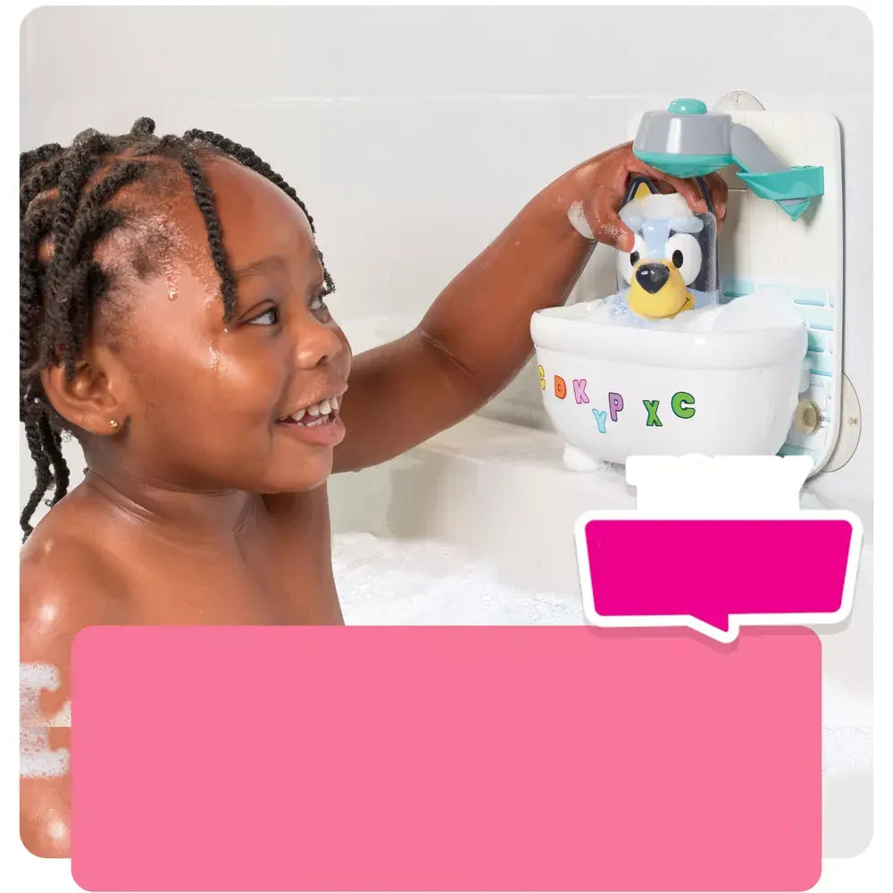 - Includes: Bluey figure with bubble tub, rinsing showerhead